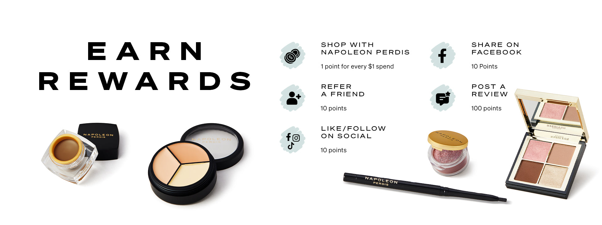 At Napoleon Perdis, every step in your beauty journey is designed to reward you. With Icon Rewards, your love for makeup doesnβt just enhance your lookβit gives back to you. Earn points every time you shop, and enjoy bonus rewards for joining, following us on social media, reviewing our products and even referring friends. From discovering new favourites to sharing the love, there are endless ways to grow your points and unlock exclusive beauty benefits.