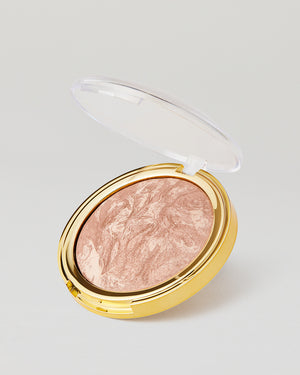 A: Yes — the marbled formula allows for versatile use. Sweep lightly across the face for warmth or focus on the high points for a subtle sheen. It pairs beautifully with any foundation or primer base.