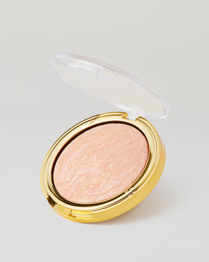 A: Glow Patrol is a baked bronzing highlighter that fuses golden and peachy tones to deliver a sun-kissed radiance. It adds warmth and luminosity in one sweep, enhancing your complexion’s natural glow.